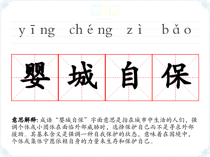 成语“婴城自保”字面意思是指在城市中生活的人们,强调个体或小团体在面临外部威胁时,选择保护自己而不是寻求外部援助。其基本含义是强调一种自我保护的状态,意味着在困境中,个体或集体宁愿依赖自身的力量来生存和保护自己。
