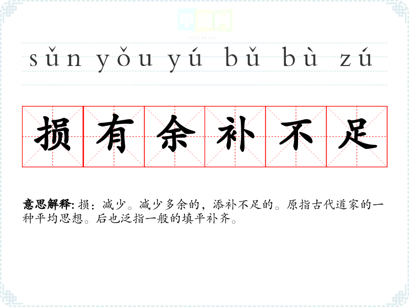 损:减少。减少多余的,添补不足的。原指古代道家的一种平均思想。后也泛指一般的填平补齐。