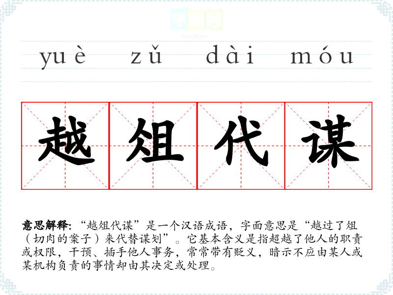 “越俎代谋”是一个汉语成语,字面意思是“越过了俎(切肉的案子)来代替谋划”。它基本含义是指超越了他人的职责或权限,干预、插手他人事务,常常带有贬义,暗示不应由某人或某机构负责的事情却由其决定或处理。