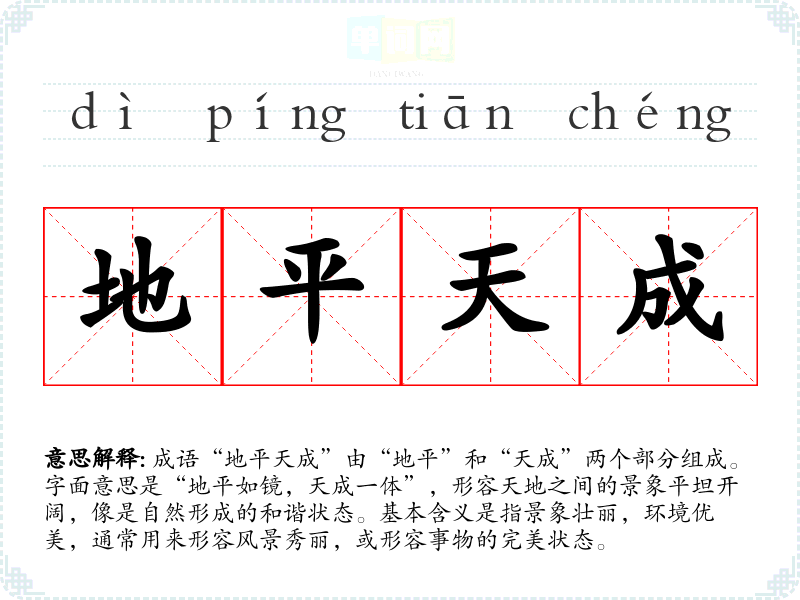 成语“地平天成”由“地平”和“天成”两个部分组成。字面意思是“地平如镜,天成一体”,形容天地之间的景象平坦开阔,像是自然形成的和谐状态。基本含义是指景象壮丽,环境优美,通常用来形容风景秀丽,或形容事物的完美状态。
