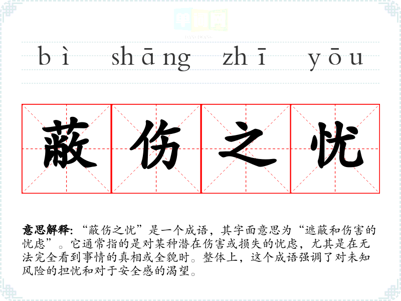 “蔽伤之忧”是一个成语,其字面意思为“遮蔽和伤害的忧虑”。它通常指的是对某种潜在伤害或损失的忧虑,尤其是在无法完全看到事情的真相或全貌时。整体上,这个成语强调了对未知风险的担忧和对于安全感的渴望。