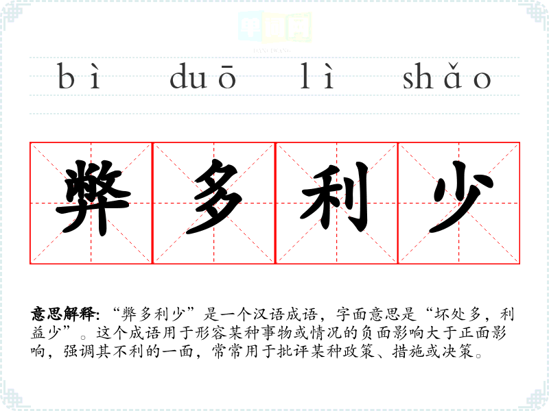 “弊多利少”作为一个成语,提醒我们在决策时要全面权衡各种因素,特别是在社会和经济层面。这不仅对语言学*的表达能力有帮助,也促使我们在生活中更加理性地分析问题,避免因只看表面利益而忽略潜在的风险和损失。