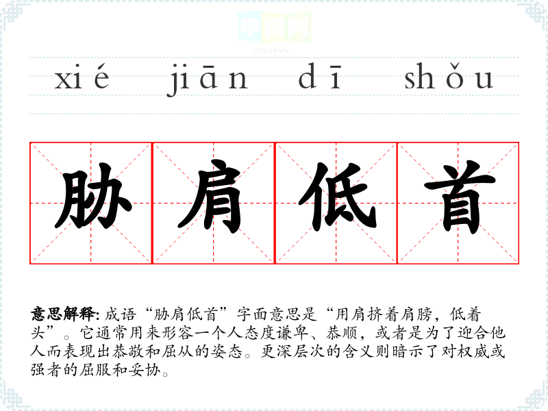 成语“胁肩低首”字面意思是“用肩挤着肩膀,低着头”。它通常用来形容一个人态度谦卑、恭顺,或者是为了迎合他人而表现出恭敬和屈从的姿态。更深层次的含义则暗示了对权威或强者的屈服和妥协。
