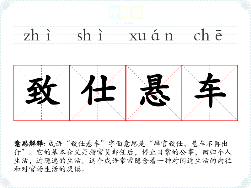 成语“致仕悬车”字面意思是“辞官致仕,悬车不再出行”。它的基本含义是指官员卸任后,停止日常的公事,回归个人生活,过隐逸的生活。这个成语常常隐含着一种对闲适生活的向往和对官场生活的厌倦。