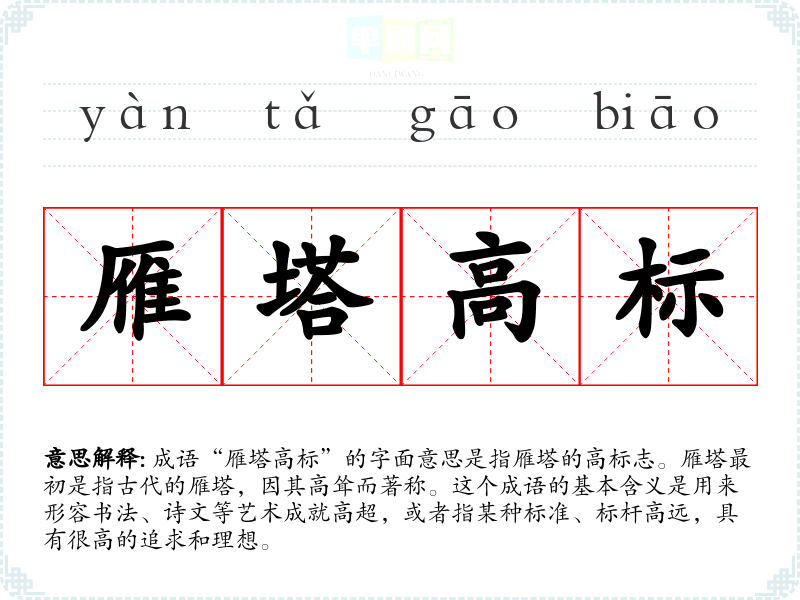 成语“雁塔高标”的字面意思是指雁塔的高标志。雁塔最初是指古代的雁塔,因其高耸而著称。这个成语的基本含义是用来形容书法、诗文等艺术成就高超,或者指某种标准、标杆高远,具有很高的追求和理想。