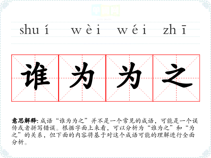 成语“谁为为之”并不是一个常见的成语,可能是一个误传或者拼写错误。根据字面上来看,可以分析为“谁为之”和“为之”的关系,但下面的内容将基于对这个成语可能的理解进行全面分析。