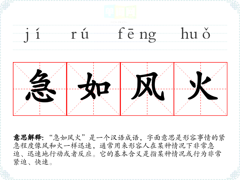 “急如风火”是一个汉语成语,字面意思是形容事情的紧急程度像风和火一样迅速,通常用来形容人在某种情况下非常急迫、迅速地行动或者反应。它的基本含义是指某种情况或行为非常紧迫、快速。