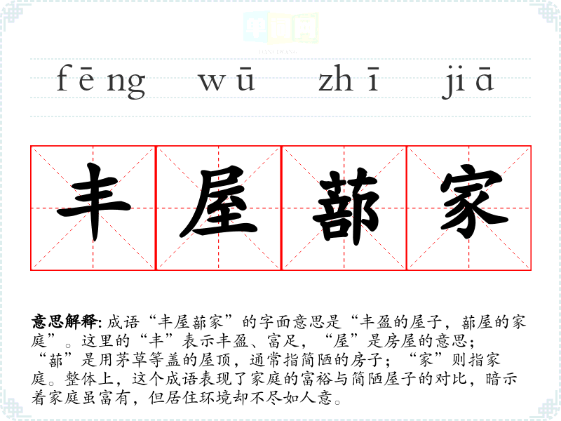 成语“丰屋蔀家”的字面意思是“丰盈的屋子,蔀屋的家庭”。这里的“丰”表示丰盈、富足,“屋”是房屋的意思;“蔀”是用茅草等盖的屋顶,通常指简陋的房子;“家”则指家庭。整体上,这个成语表现了家庭的富裕与简陋屋子的对比,暗示着家庭虽富有,但居住环境却不尽如人意。