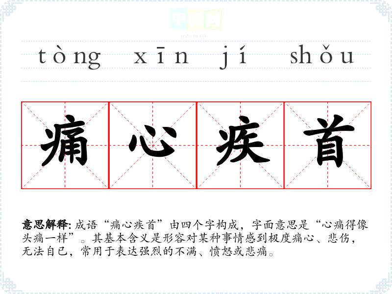 成语“痛心疾首”由四个字构成,字面意思是“心痛得像头痛一样”。其基本含义是形容对某种事情感到极度痛心、悲伤,无法自已,常用于表达强烈的不满、愤怒或悲痛。