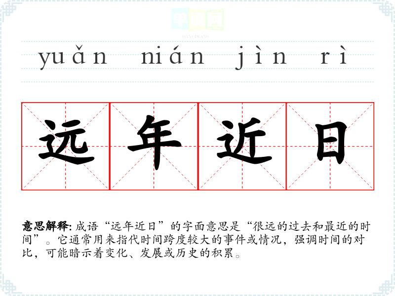 “远年近日”并不是一个历史悠久的成语,可能是在现代汉语中比较常用的表达。它的构成上可以看作是对时间的划分,常用来描述某种现象或趋势的演变过程。在古典文学中,类似的表达方式虽并不常见,但在对时间的描绘上,古人常常使用“往昔”“今朝”等词汇。