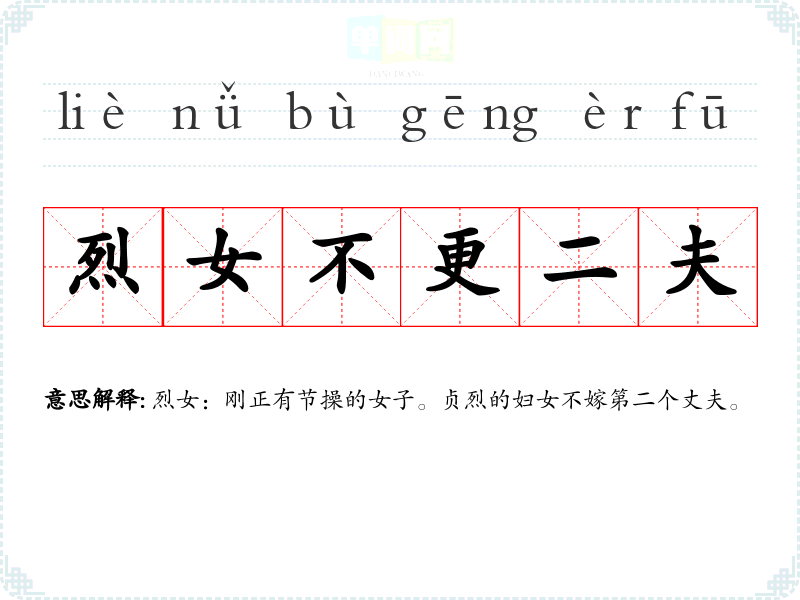 | 烈女不更二夫 | 烈女:刚正有节操的女子。贞烈的妇女不嫁第二个丈夫。 |