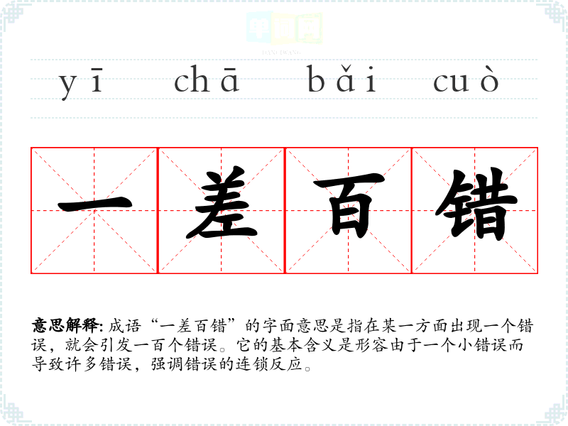 成语“一差百错”的字面意思是指在某一方面出现一个错误,就会引发一百个错误。它的基本含义是形容由于一个小错误而导致许多错误,强调错误的连锁反应。