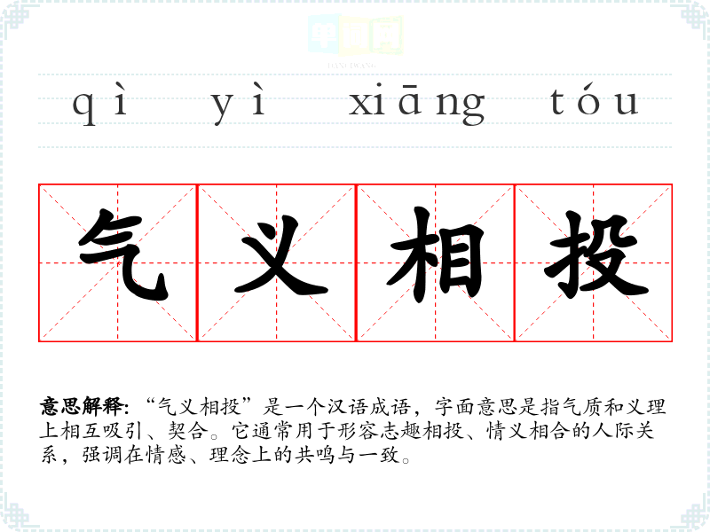 | 气义相投 | 指志趣、情谊互相投合。 |