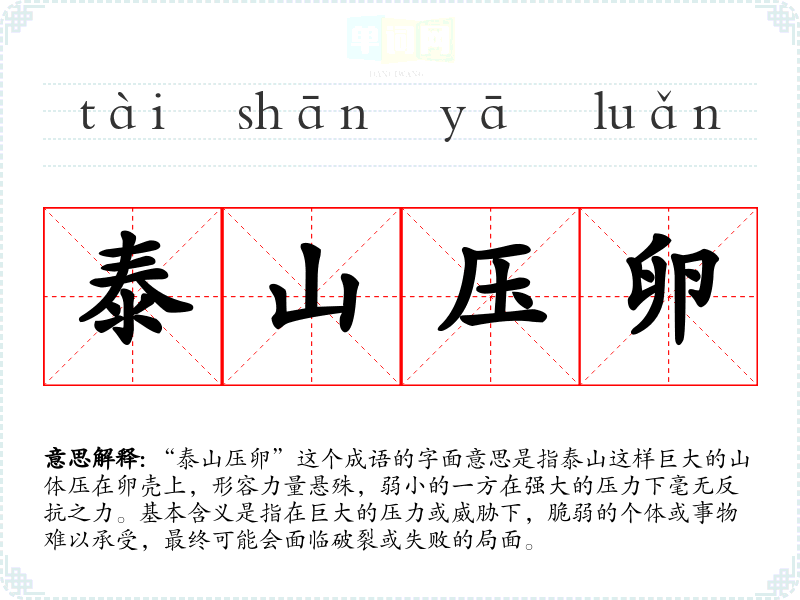 “泰山压卵”这个成语的字面意思是指泰山这样巨大的山体压在卵壳上,形容力量悬殊,弱小的一方在强大的压力下毫无反抗之力。基本含义是指在巨大的压力或威胁下,脆弱的个体或事物难以承受,最终可能会面临破裂或失败的局面。