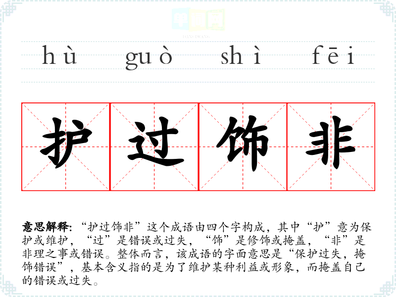 “护过饰非”这个成语由四个字构成,其中“护”意为保护或维护,“过”是错误或过失,“饰”是修饰或掩盖,“非”是非理之事或错误。整体而言,该成语的字面意思是“保护过失,掩饰错误”,基本含义指的是为了维护某种利益或形象,而掩盖自己的错误或过失。