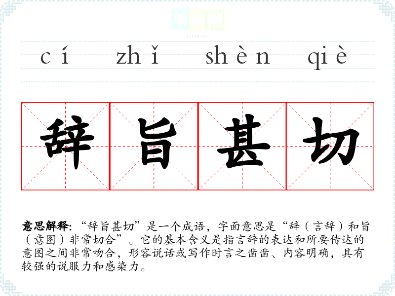 “辞旨甚切”是一个成语,字面意思是“辞(言辞)和旨(意图)非常切合”。它的基本含义是指言辞的表达和所要传达的意图之间非常吻合,形容说话或写作时言之凿凿、内容明确,具有较强的说服力和感染力。