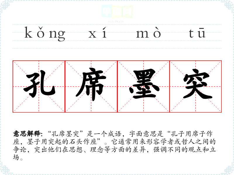 “孔席墨突”是一个成语,字面意思是“孔子用席子作座,墨子用突起的石头作座”。它通常用来形容学者或哲人之间的争论,突出他们在思想、理念等方面的差异,强调不同的观点和立场。