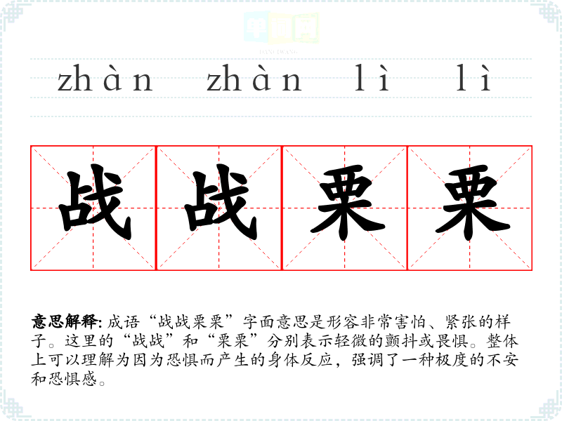 成语“战战栗栗”字面意思是形容非常害怕、紧张的样子。这里的“战战”和“栗栗”分别表示轻微的颤抖或畏惧。整体上可以理解为因为恐惧而产生的身体反应,强调了一种极度的不安和恐惧感。