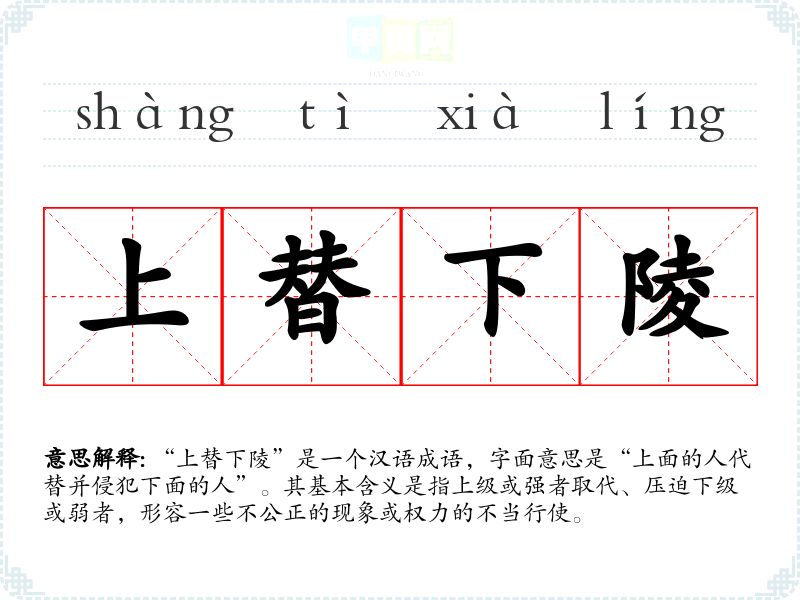 “上替下陵”是一个汉语成语,字面意思是“上面的人代替并侵犯下面的人”。其基本含义是指上级或强者取代、压迫下级或弱者,形容一些不公正的现象或权力的不当行使。