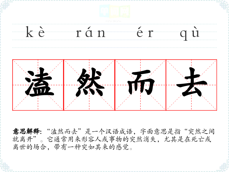 “溘然而去”是一个汉语成语,字面意思是指“突然之间就离开”。它通常用来形容人或事物的突然消失,尤其是在死亡或离世的场合,带有一种突如其来的感觉。