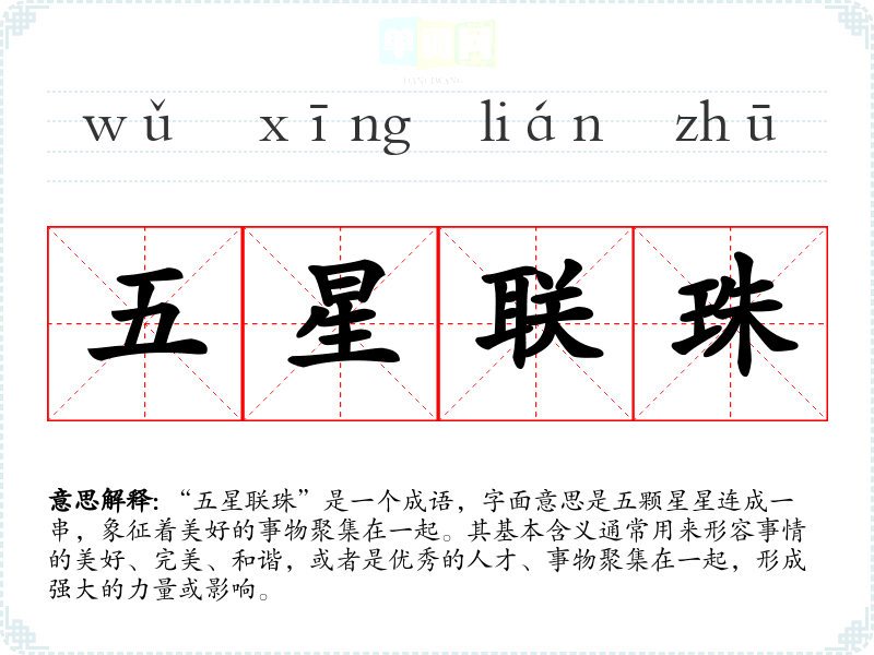 “五星联珠”是一个成语,字面意思是五颗星星连成一串,象征着美好的事物聚集在一起。其基本含义通常用来形容事情的美好、完美、和谐,或者是优秀的人才、事物聚集在一起,形成强大的力量或影响。