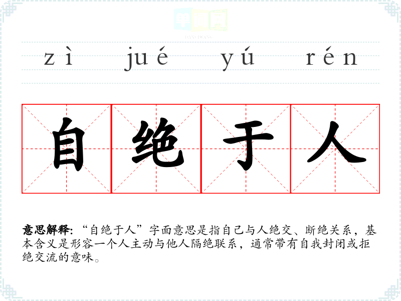 “自绝于人”字面意思是指自己与人绝交、断绝关系,基本含义是形容一个人主动与他人隔绝联系,通常带有自我封闭或拒绝交流的意味。