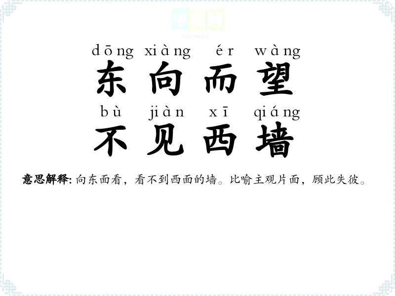 | 东向而望,不见西墙 | 向东面看,看不到西面的墙。比喻主观片面,顾此失彼。 |