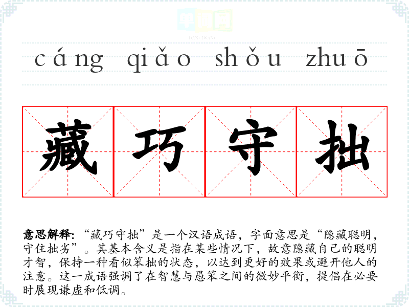 - 演讲:在职场或自我提升的演讲中,讲者可能会提到“藏巧守拙”作为一种策略,以鼓励听众在竞争激烈的环境中采取谦逊的态度。