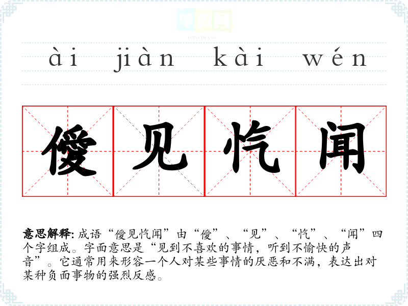 成语“僾见忾闻”由“僾”、“见”、“忾”、“闻”四个字组成。字面意思是“见到不喜欢的事情,听到不愉快的声音”。它通常用来形容一个人对某些事情的厌恶和不满,表达出对某种负面事物的强烈反感。