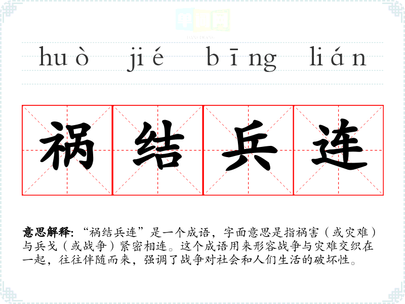 | 兵连祸结 | 兵:战争;连:接连;结:相联。战争接连不断,带来了无穷的灾祸。 |