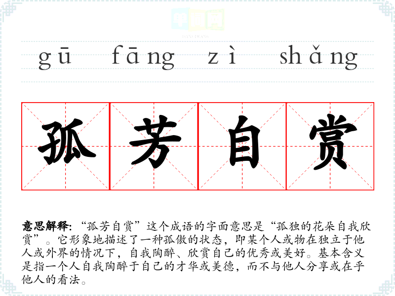 “孤芳自赏”给人一种孤独却又高傲的感觉,常常让我联想到那些在群体中独立思考、追求个人价值的人。它也提醒我在自我欣赏的同时,不要忘记与他人的沟通与互动。