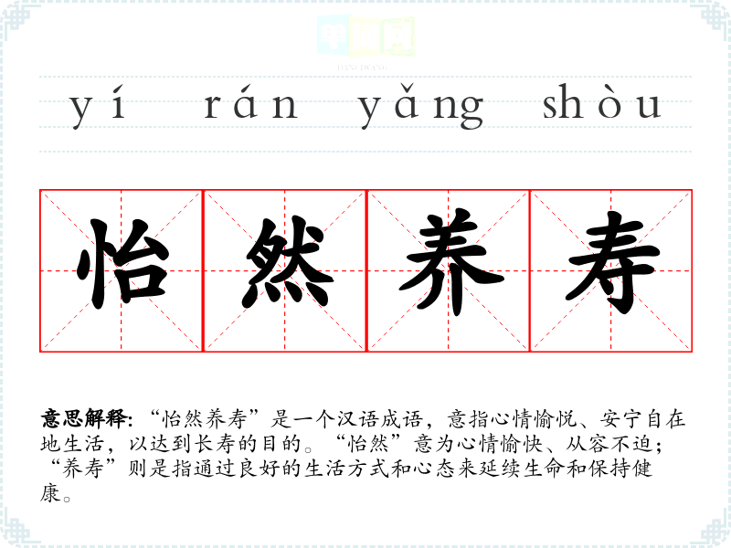 “怡然养寿”是一个汉语成语,意指心情愉悦、安宁自在地生活,以达到长寿的目的。“怡然”意为心情愉快、从容不迫;“养寿”则是指通过良好的生活方式和心态来延续生命和保持健康。