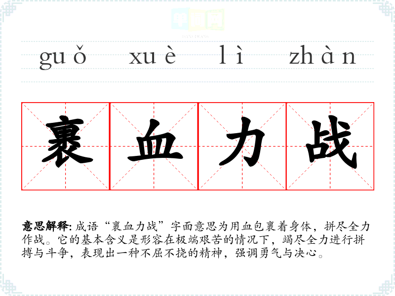 “裹血力战”并没有明确的历史来源或典故,但可以推测其形成与古代战争经历有关,人们在极度困境中,为了生存和胜利,不得不拼尽全力,甚至不惜以血肉之躯作为代价。这种精神在历史上许多战役和故事中都有体现,如古代士兵为国家、为信仰而不惜牺牲的情景。