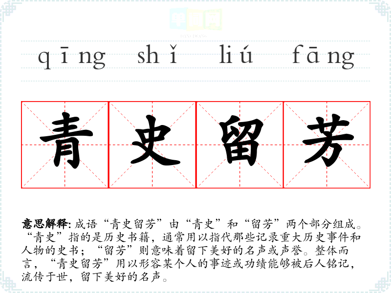 “青史留芳”这一成语的具体来源并不明确,但其深厚的历史背景与古代对历史的重视密不可分。自古以来就有“留名青史”的说法,意在强调个人的功绩能够被后人传颂。此成语可追溯至对历史人物的评价,尤其是那些以德行、才能、贡献而被后人铭记的人物。