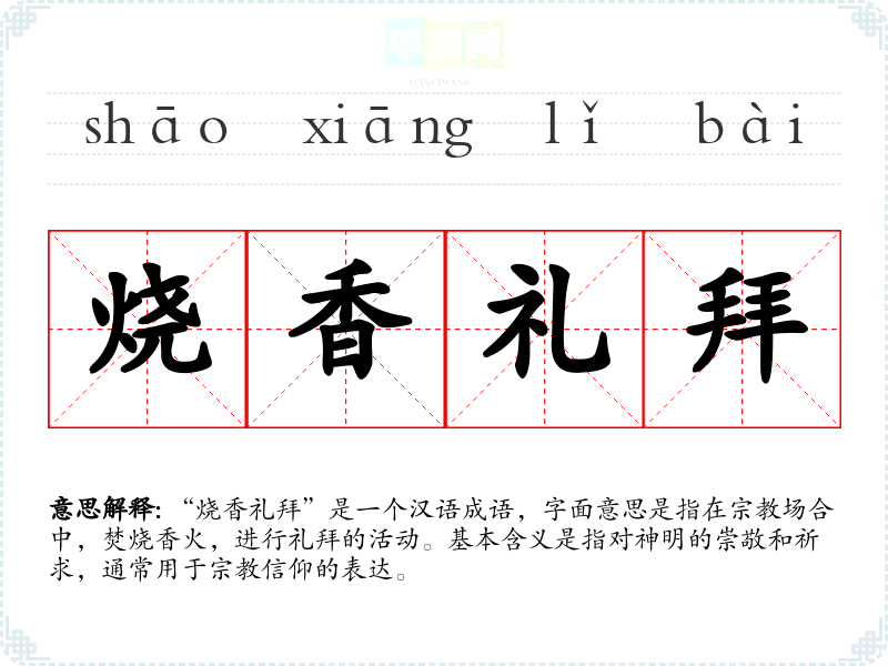 | 焚香礼拜 | 焚香:点燃香火;礼拜:向尊敬的人或神灵行礼跪拜。烧香跪拜,以表尊敬服从之意。 |