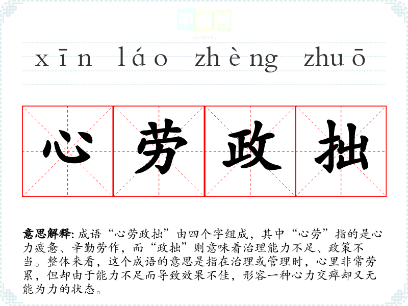 成语“心劳政拙”由四个字组成,其中“心劳”指的是心力疲惫、辛勤劳作,而“政拙”则意味着治理能力不足、政策不当。整体来看,这个成语的意思是指在治理或管理时,心里非常劳累,但却由于能力不足而导致效果不佳,形容一种心力交瘁却又无能为力的状态。