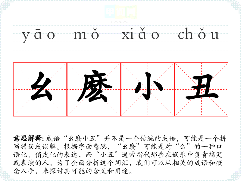 成语“幺麽小丑”并不是一个传统的成语,可能是一个拼写错误或误解。根据字面意思,“幺麽”可能是对“么”的一种口语化、俏皮化的表达,而“小丑”通常指代那些在娱乐中负责搞笑或表演的人。为了全面分析这个词汇,我们可以从相关的成语和概念入手,来探讨其可能的含义和用途。
