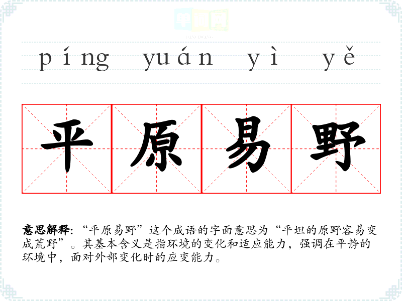“平原易野”这个成语的字面意思为“平坦的原野容易变成荒野”。其基本含义是指环境的变化和适应能力,强调在平静的环境中,面对外部变化时的应变能力。