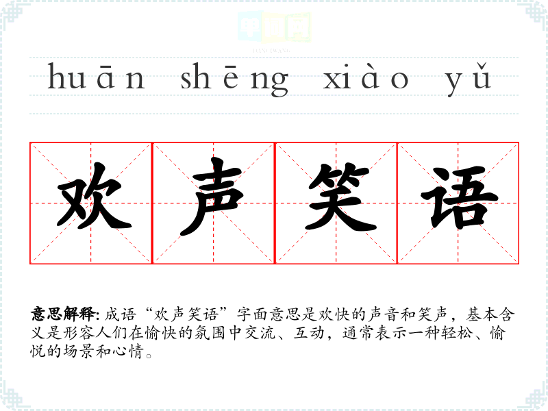 成语“欢声笑语”字面意思是欢快的声音和笑声,基本含义是形容人们在愉快的氛围中交流、互动,通常表示一种轻松、愉悦的场景和心情。