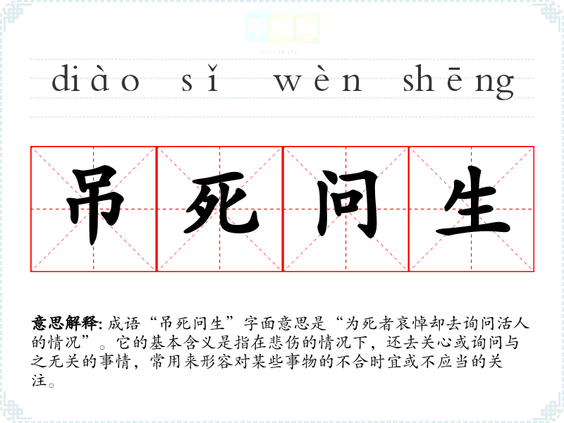 成语“吊死问生”字面意思是“为死者哀悼却去询问活人的情况”。它的基本含义是指在悲伤的情况下,还去关心或询问与之无关的事情,常用来形容对某些事物的不合时宜或不应当的关注。
