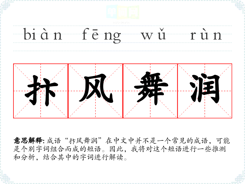 成语“抃风舞润”在中文中并不是一个常见的成语,可能是个别字词组合而成的短语。因此,我将对这个短语进行一些推测和分析,结合其中的字词进行解读。