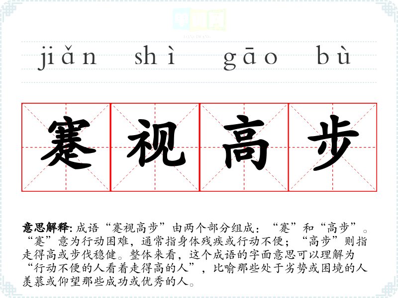 成语“蹇视高步”由两个部分组成:“蹇”和“高步”。“蹇”意为行动困难,通常指身体残疾或行动不便;“高步”则指走得高或步伐稳健。整体来看,这个成语的字面意思可以理解为“行动不便的人看着走得高的人”,比喻那些处于劣势或困境的人羡慕或仰望那些成功或优秀的人。