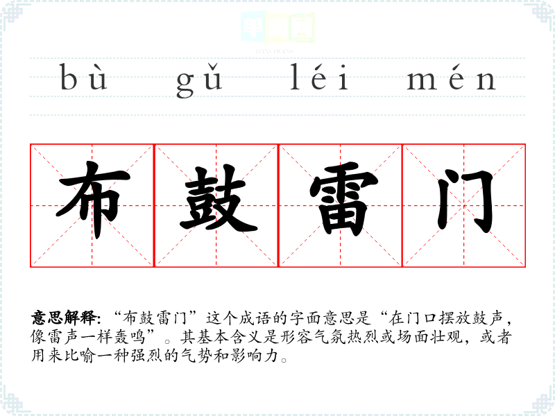 “布鼓雷门”这个成语的字面意思是“在门口摆放鼓声,像雷声一样轰鸣”。其基本含义是形容气氛热烈或场面壮观,或者用来比喻一种强烈的气势和影响力。