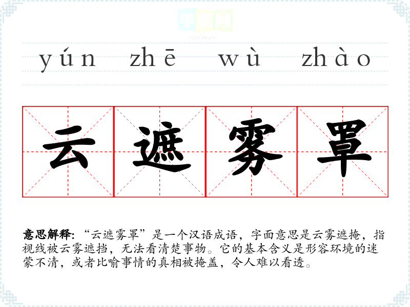 | 云遮雾罩 | 罩:覆盖。山被云雾笼罩,看不清它的真实面目。比喻故弄玄虚,暧昧不明。 |