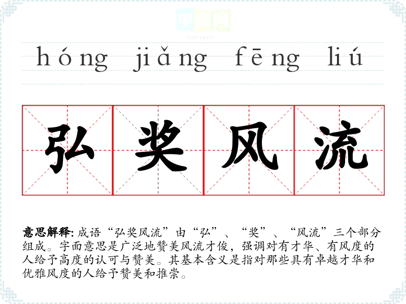 成语“弘奖风流”由“弘”、“奖”、“风流”三个部分组成。字面意思是广泛地赞美风流才俊,强调对有才华、有风度的人给予高度的认可与赞美。其基本含义是指对那些具有卓越才华和优雅风度的人给予赞美和推崇。