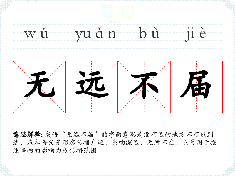 成语“无远不届”的字面意思是没有远的地方不可以到达,基本含义是形容传播广泛、影响深远、无所不在。它常用于描述事物的影响力或传播范围。