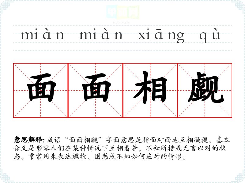 成语“面面相觑”字面意思是指面对面地互相凝视,基本含义是形容人们在某种情况下互相看着,不知所措或无言以对的状态。常常用来表达尴尬、困惑或不知如何应对的情形。