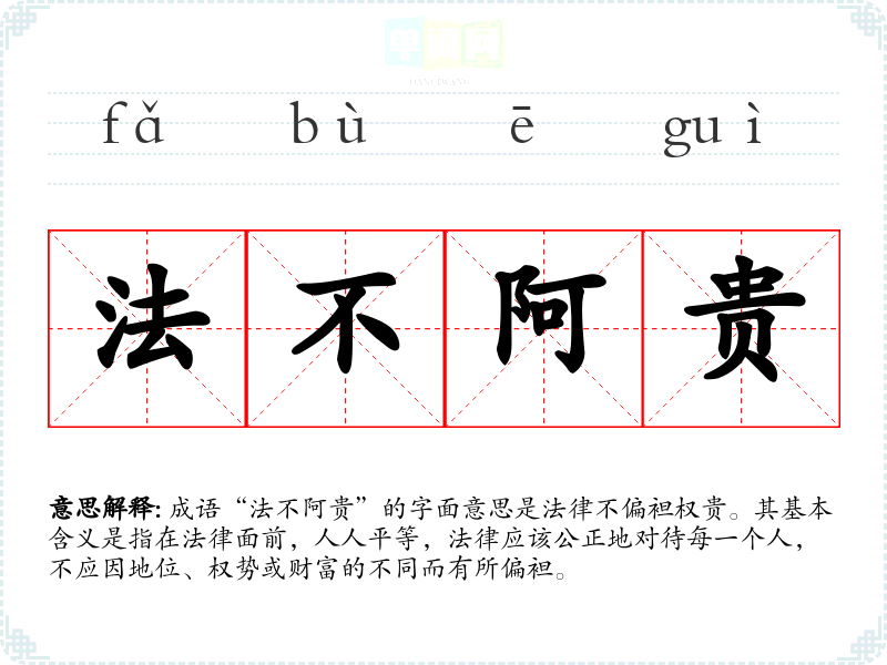 成语“法不阿贵”的字面意思是法律不偏袒权贵。其基本含义是指在法律面前,人人平等,法律应该公正地对待每一个人,不应因地位、权势或财富的不同而有所偏袒。