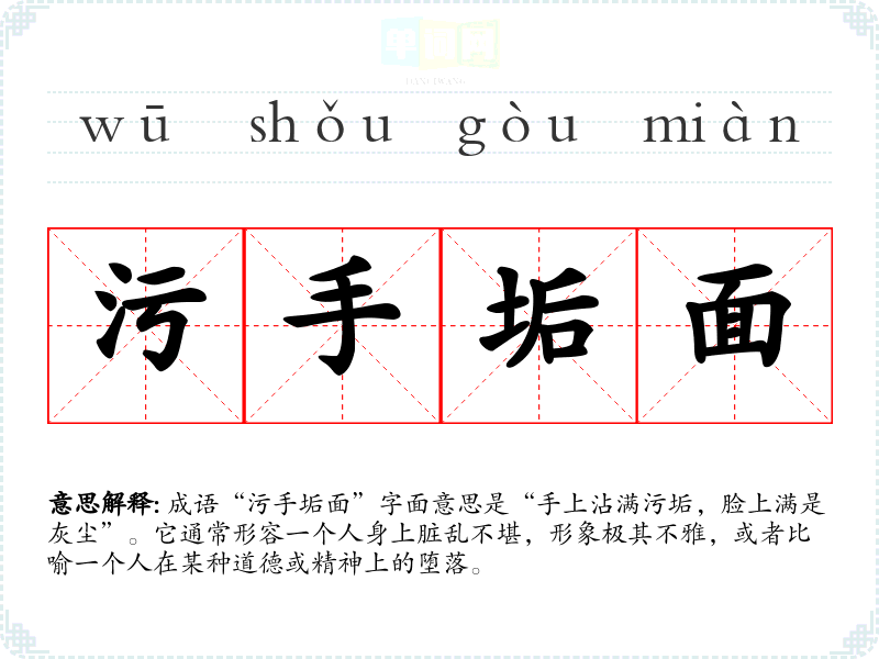 成语“污手垢面”字面意思是“手上沾满污垢,脸上满是灰尘”。它通常形容一个人身上脏乱不堪,形象极其不雅,或者比喻一个人在某种道德或精神上的堕落。