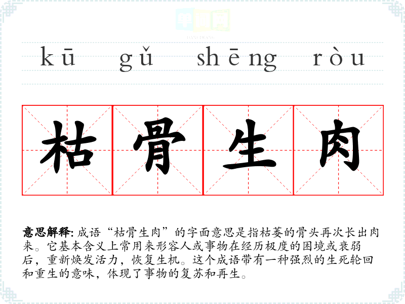 成语“枯骨生肉”的字面意思是指枯萎的骨头再次长出肉来。它基本含义上常用来形容人或事物在经历极度的困境或衰弱后,重新焕发活力,恢复生机。这个成语带有一种强烈的生死轮回和重生的意味,体现了事物的复苏和再生。